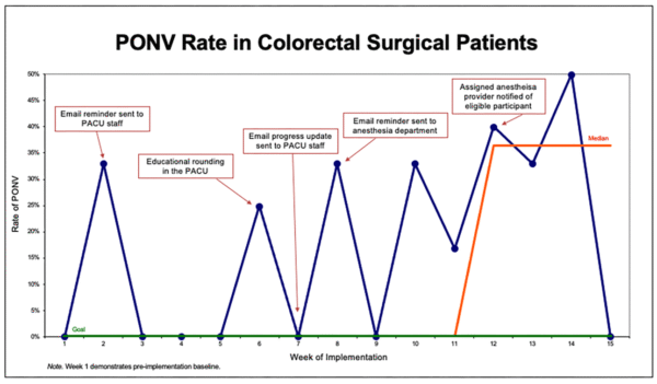 Figure 1. Run Chart Displaying Outcome Measure (PONV Rate in Colorectal Surgical
