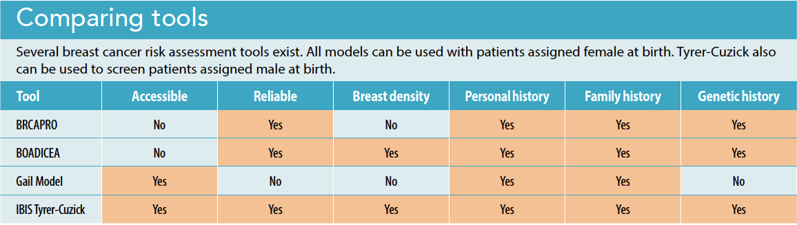 Many validated tools exist for breast cancer risk screening. The Gail Model, BRCAPRO, and Breast and Ovarian Analysis of Disease Incidence and Carrier Estimation Algorithm (BOADICEA) tools all include personal and family history in the risk estimation; however, each has limitations for widespread use. For example, the Gail Model doesn’t include breast density in the risk calculation. Therefore, it’s less reliable when used in certain patient populations, including women with a personal history of breast cancer; women who carry genetic mutations; and Black, Hispanic, and Asian women. The BRCAPRO model also doesn’t include breast density in the calculation, and it requires a subscription, which limits its accessibility. The BOADICEA includes density in the risk assessment, but it’s not easily accessible.