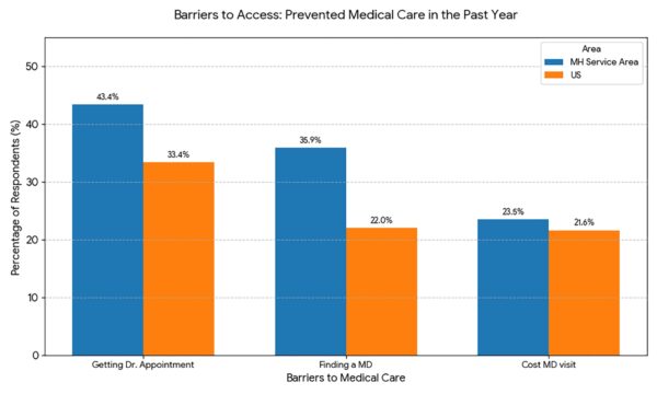 The data depicted below lists the common barriers to accessing medical care (Getting a Doctor’s Appointment, Finding an MD, and Cost of MD Visit) are pertinent to addressing several high-priority health needs. Other needs identified in order of priority include access to health care services, substance use, diabetes, and disabling conditions.