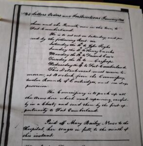 While completing my studies at CSUSB and conducting research for my Senior Honor’s Project (2005) about Nurses in the Military, I found the following written in George Washington’s hand: “Letters Orders and Instructions January 1756: Paid off Mary Bailey, Nurse to the Hospital, her wages in full, to the ninth of this instant.”[i] What is interesting about Washington’s entry is that while he was of the opinion that women didn’t belong in camp with the soldiers – a view he had during the French & Indian War and carried through during the American Revolution – he also recognized that his soldiers needed care when wounded, food (if it could be found) to nourish their bodies, and men to stay at the front. If the men were worried about their families, they would leave at the end of their conscription or they would be AWOL. Hence, by the time of the American Revolution, Washington realized that women were a necessity to the men and the women knew that in many cases, they were safer with their men on the front than in their homes awaiting raids by the British. Of note is that her name surfaced in the pages of Richard Berleth book Bloody Mohawk: The French and Indian War & American Revolution on New York’s Frontier (2009).