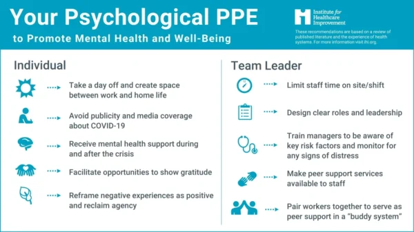 Building on this framework, I’m sharing the concept of “Psychological PPE” as a complementary lens to the points discussed in the article. The Institute for Healthcare Improvement (IHI) developed “Psychological PPE: Promote health care workforce mental health and well-being” based on research and evidence-based recommendations aimed at protecting and supporting the mental health and well-being of the healthcare workforce during and after the COVID-19 pandemic. IHI reviewed available evidence on interventions that help protect staff mental health under extreme working conditions, including natural disasters, terrorist attacks, and prior pandemics. This research was synthesized into a set of evidence-based “Psychological PPE” recommendations.