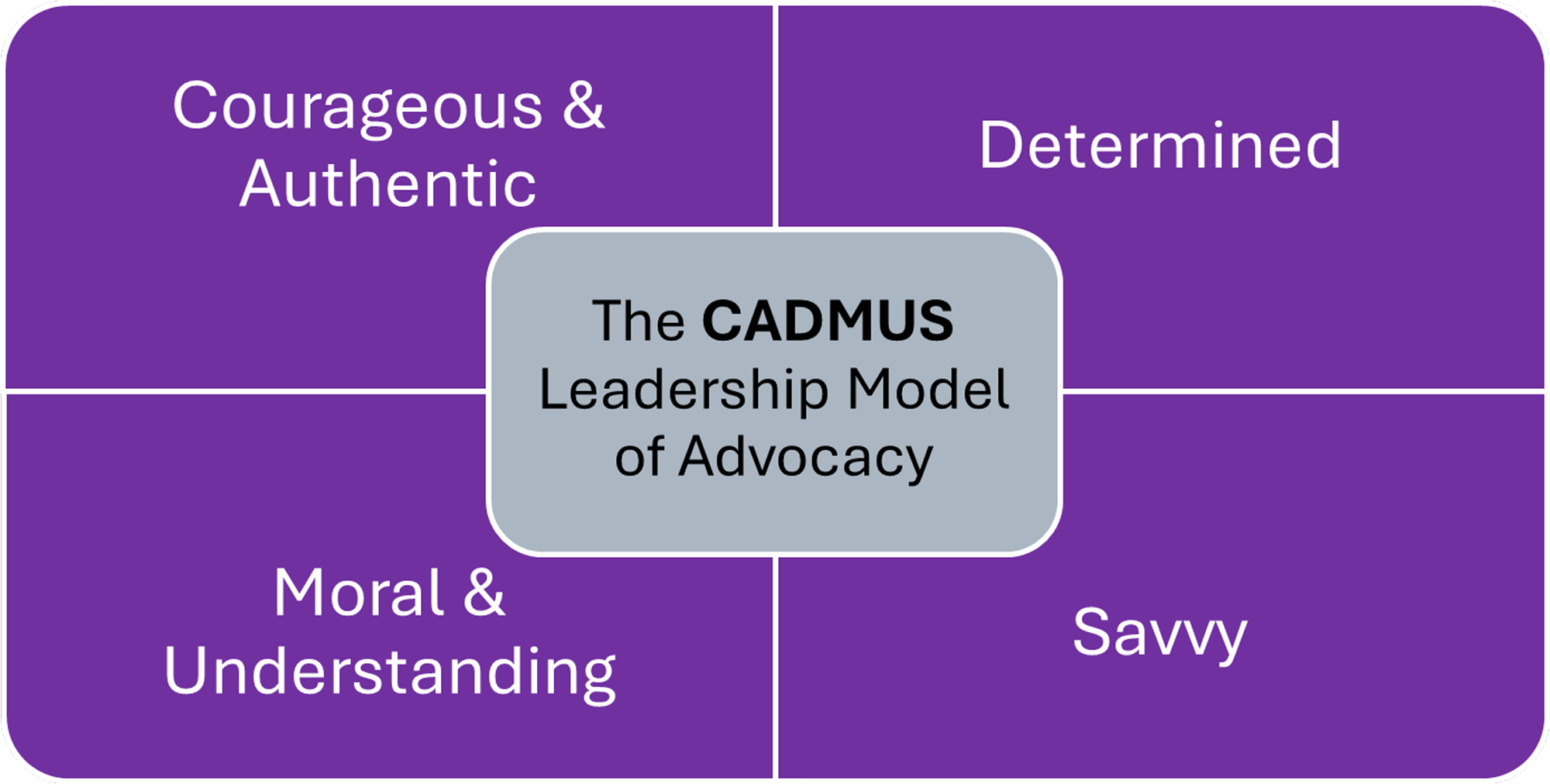A leadership model for advocacy was developed upon reflection of Dr. Edna Cadmus’ career and the leadership qualities she demonstrated in her policy advocacy role. Dr. Cadmus was the Executive Director of the New Jersey Collaborating Center for Nursing and Clinical Professor with the Rutgers School of Nursing. Upon her retirement in June 2025 after 49 years of service to the nursing profession, a joint legislative resolution in celebration of her career was issues and stated, “Within all spheres of her life and work, Dr. Cadmus has established a model to emulate and set a standard of excellence toward which all others might strive” (The State of New Jersey, 2025). She was experienced and talented in policy advocacy, educating legislators on a plethora of topics throughout her career, beginning as a staff nurse to chief nurse officer President of the Organization of Nurse Leaders New Jersey, and Executive Director of NJCCN. The CADMUS Leadership Model of Advocacy, representing Dr. Cadmus’ leadership traits of Courageous and Authentic, Determined, Moral and Understanding, and Savvy, provides a framework for nurses to utilize in their advocacy efforts (Figure 1 and Table 1). While initially designed for the legislative policy arena, the model can be adapted for various policy and advocacy contexts.